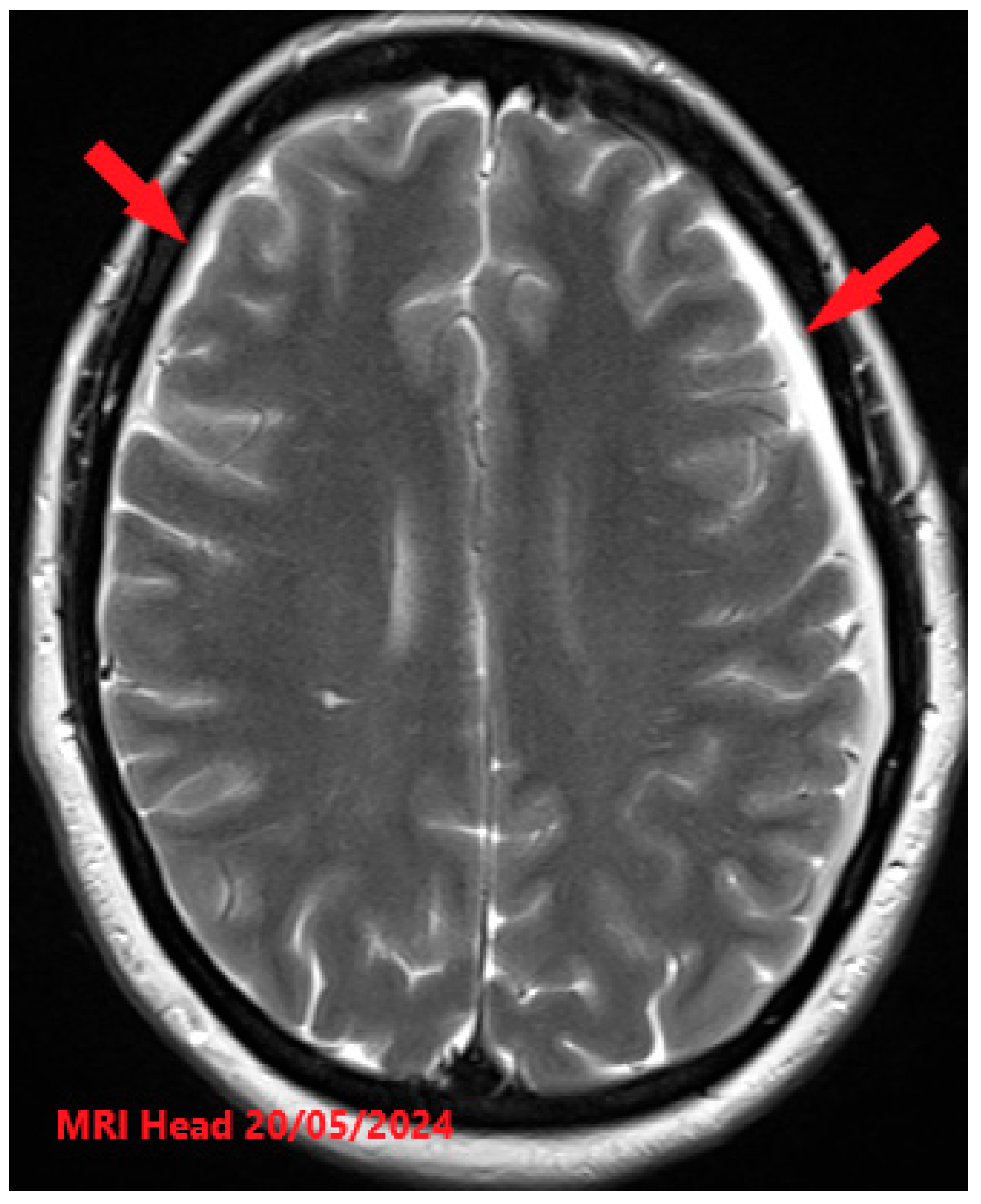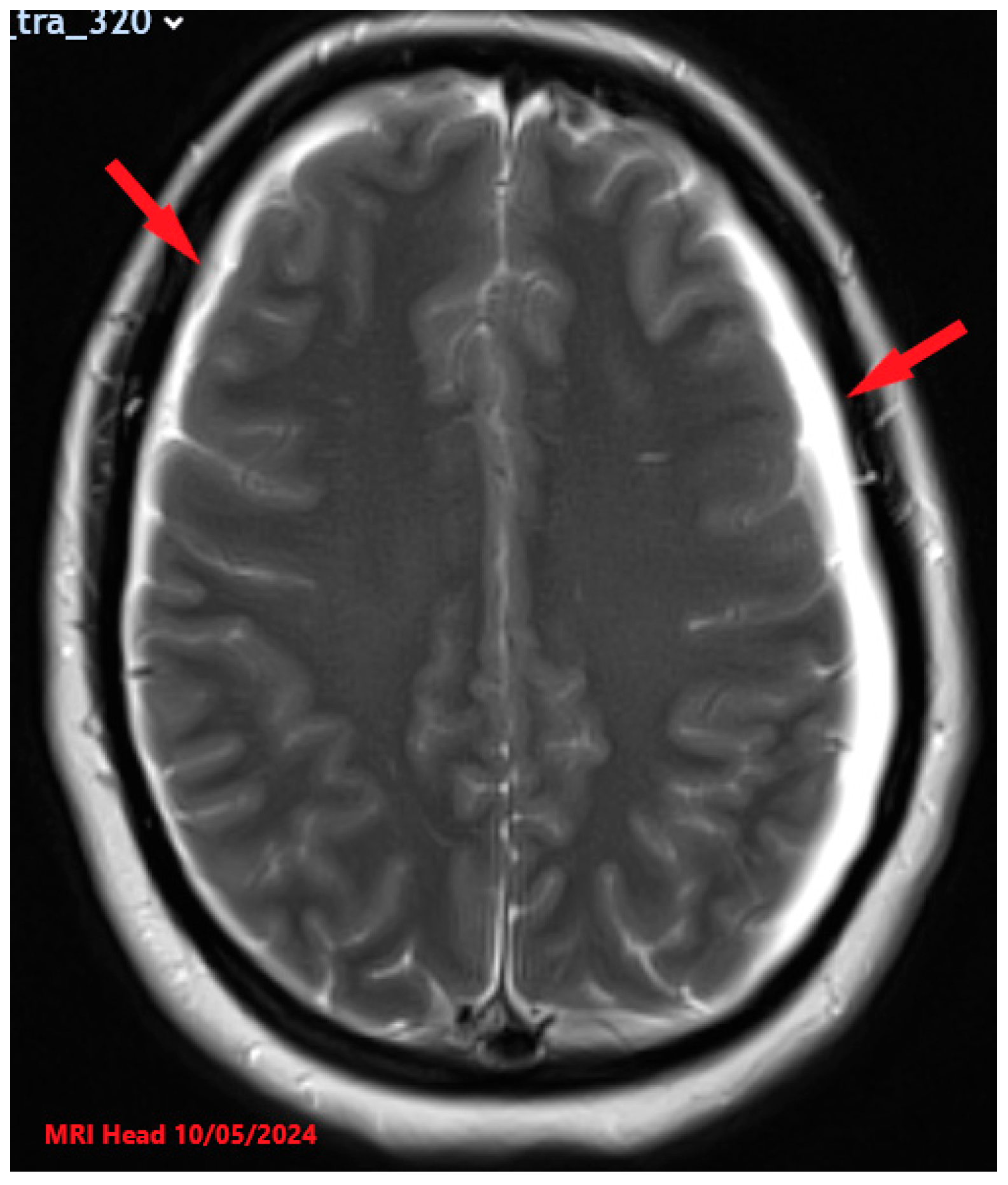 Figure 1. T2-weighted MRI Head with contrast axial view image findings showing initial presentation with significant bilateral subdural CSF collections (red arrows) and associated pachymeningeal enhancement and thickening.