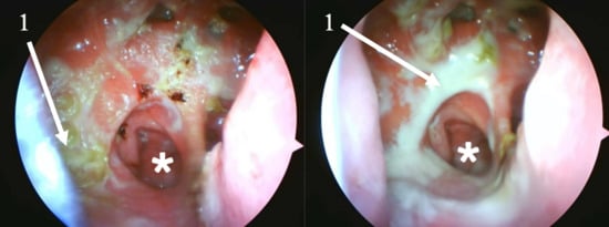Endoscopic progression of the nasal cavity during treatment. Imaging was done using 0-degree rigid endoscope. 1—purulent discharge and crusting. *—Right choana. Large septal perforation can be observed on the right. Day 4 post-treatment initiation (left), showing heavy crusting and purulent discharge obscuring the underlying mucosa. Day 7 (right), following debridement, revealing persistent inflammation and increased purulent discharge. This transition from solid, tenacious crusts to a more liquid discharge is considered a beneficial clinical progression, as the purulent material can be effectively cleared with intensive nasal douching rather than requiring mechanical removal with forceps.