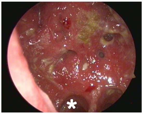 Endoscopic picture at the 3-month follow-up. *—Right choana. A relatively clean nasal cavity with significant reduction in crusting and inflammation can be observed. Imaging was done using 30-degree rigid endoscope through left nostril and different camera unit, thus contributing to different angle and colour gamma.