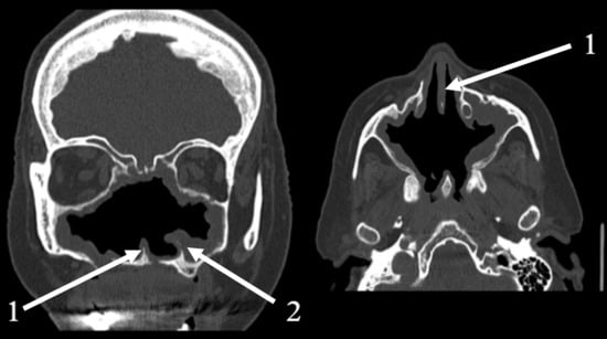 Coronal (left) and axial (right) CT scans of the paranasal sinuses. 1—remnants of nasal septum; 2—remnants of left inferior turbinate. Coronal view demonstrating the complete absence of nasal turbinates, severe resorption of the lateral nasal walls, and diffuse mucosal thickening. Axial view highlighting the extremely widened nasal cavity and a large posterior septal perforation.
