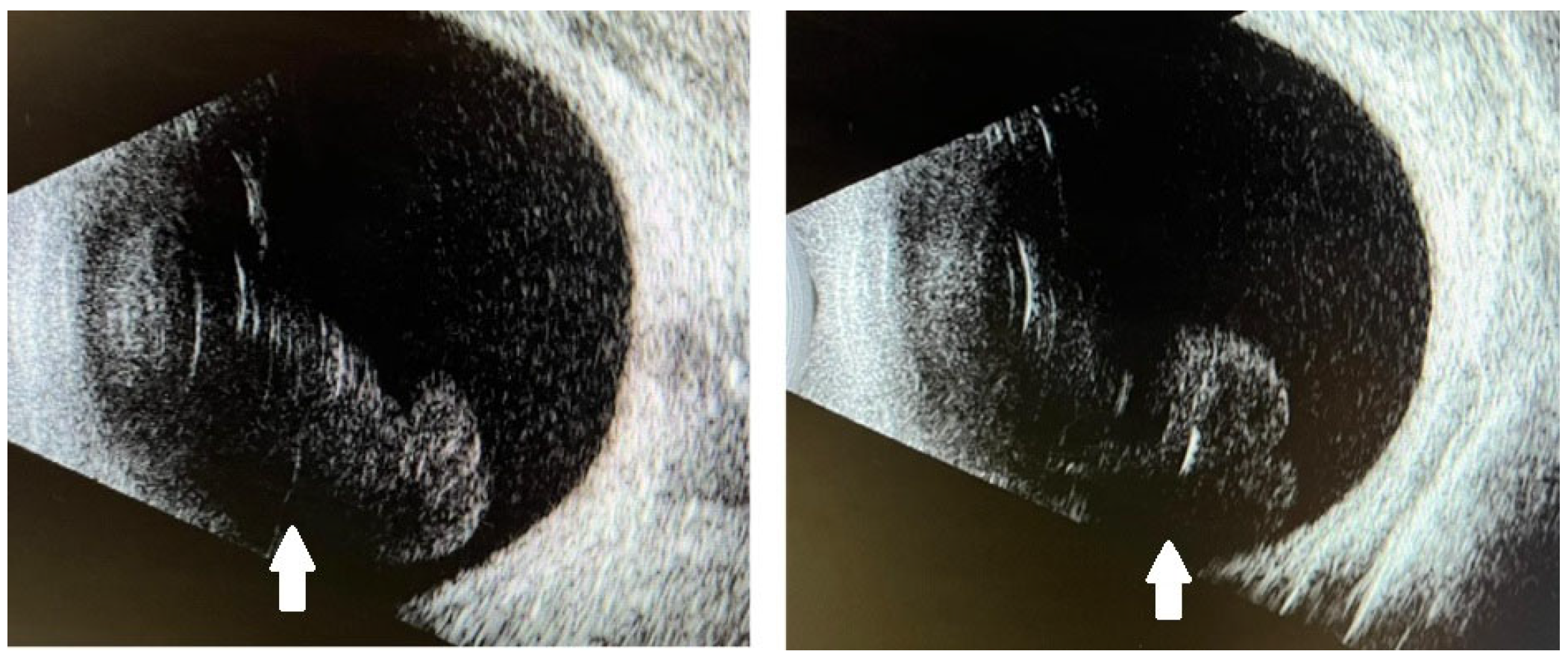 - Ng, C.C.; Brill, D.; Cunningham, E.T.J.; Burckhard, B.A.; Jumper, J.M.; Heier, J.; Rifkin, L.M.; Eliott, D.; McDonald, H.R.; Sobrin, L. Catastrophic, Bilateral Retinal Vascular Occlusion After Intravitreal Bevacizumab Injection. Retin. Cases Brief Rep. 2023, 17, 81–84. [Google Scholar] [CrossRef]