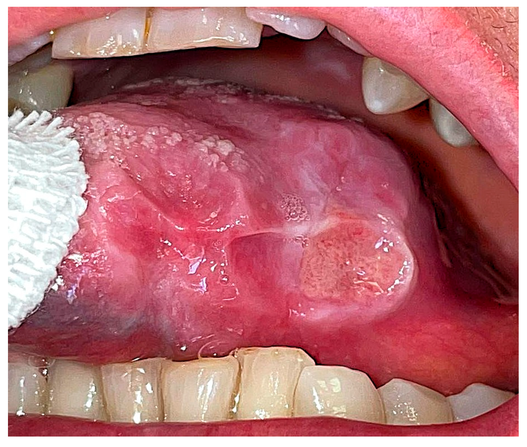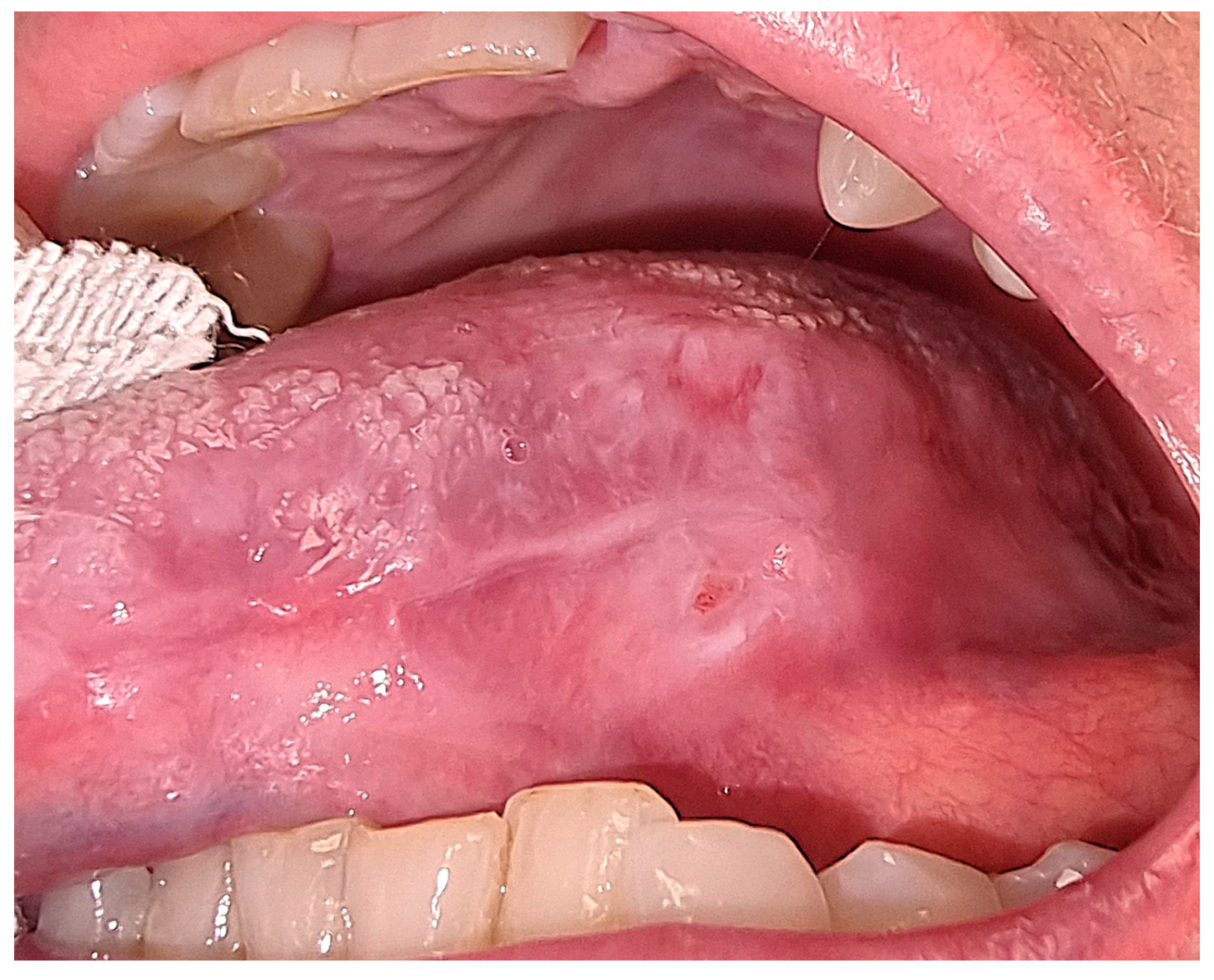 - Kachlan, M.O.; Brooks, J.K.; Fantozzi, P.J.; Tenore, G.; Romeo, U.; Pergolini, D.; Sultan, A.S. Oral mucosal adverse events following administration of an immune checkpoint inhibitor: A case report. Gen. Dent. 2025, 73, 10–14. [Google Scholar] [PubMed]