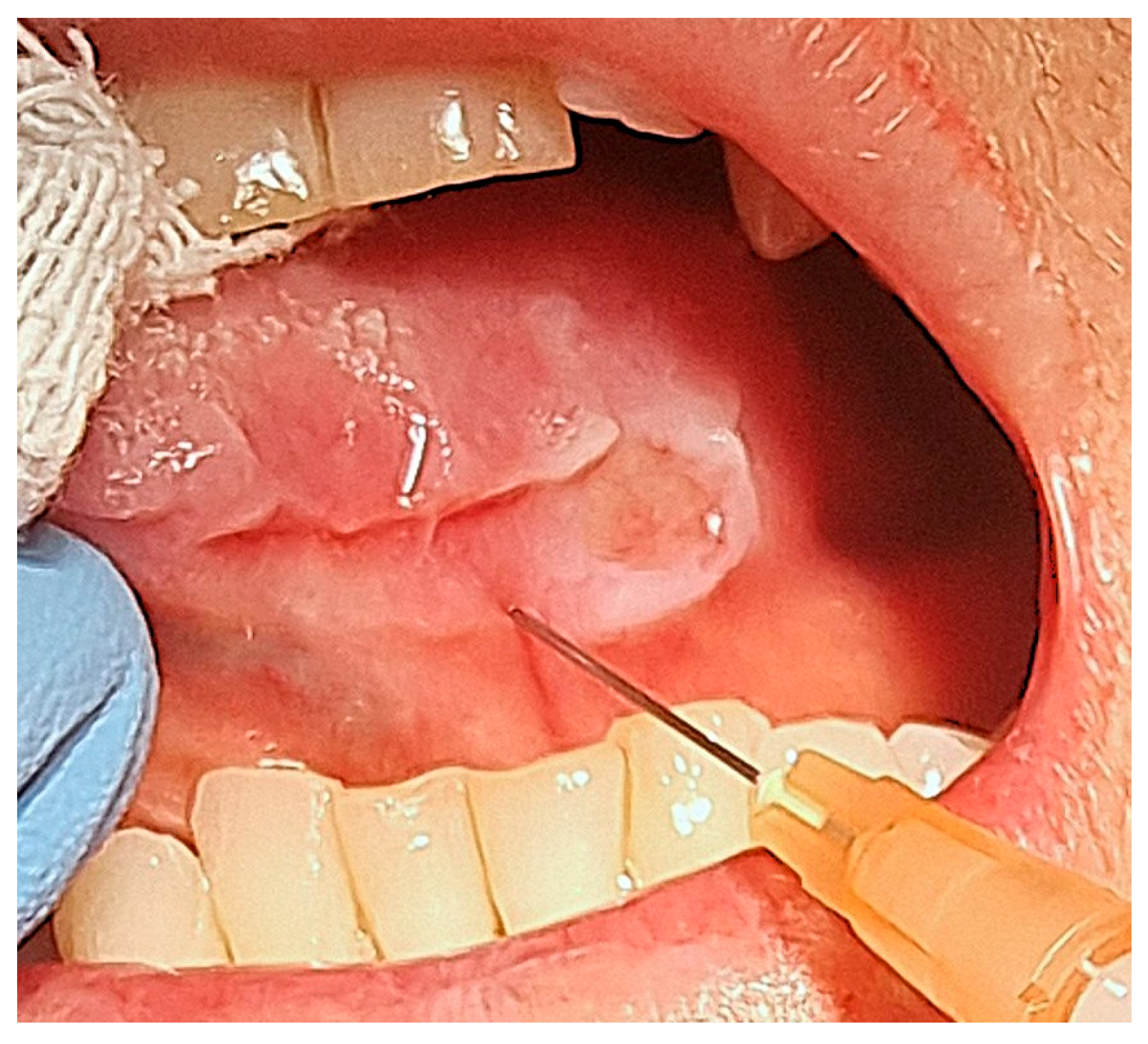 - Kang, K.H.; Byun, J.S.; Jung, J.K.; Kim, J.R. Mucosal deposit after triamcinolone injection: A case report. BMC Oral Health 2025, 25, 561. [Google Scholar] [CrossRef] [PubMed] [PubMed Central]