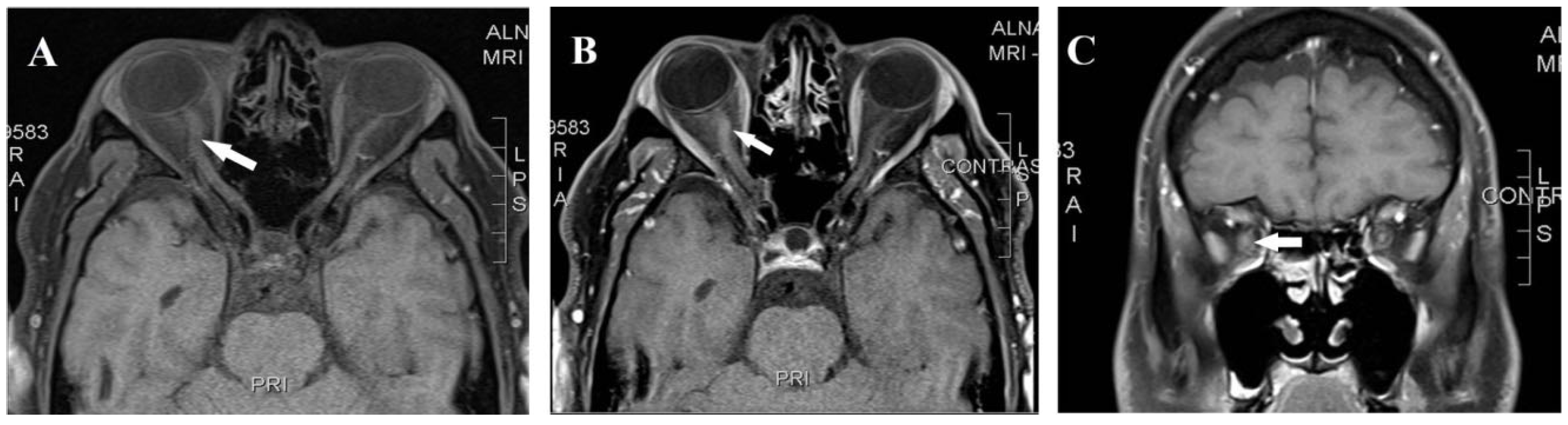 - Horiuchi, K.; Nakamura, S.; Yamada, K. Leber Hereditary Optic Neuropathy With Magnetic Resonance Imaging Findings Suggestive of Optic Perineuritis and Optic Neuritis: A Diagnostic Challenge. Cureus 2025, 17, e80439. [Google Scholar] [CrossRef] [PubMed]