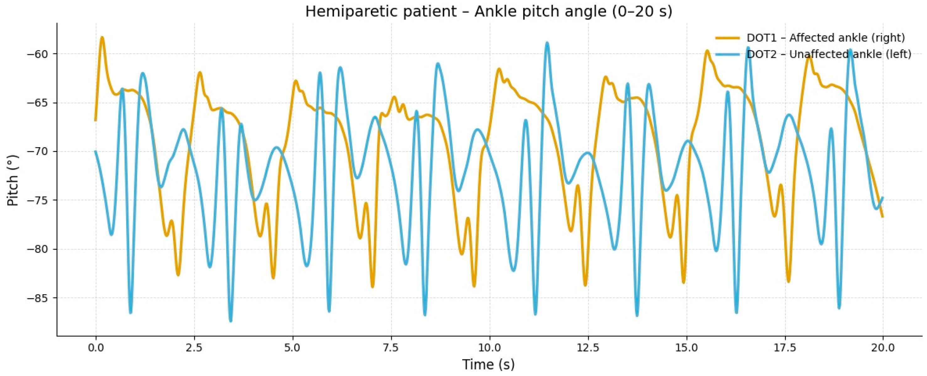 In the hemiparetic patient, during slow-speed gait (0–20 s), the affected limb showed reduced oscillation amplitude and irregular angular cycles compared to the non-affected side, reflecting impaired distal motor control (