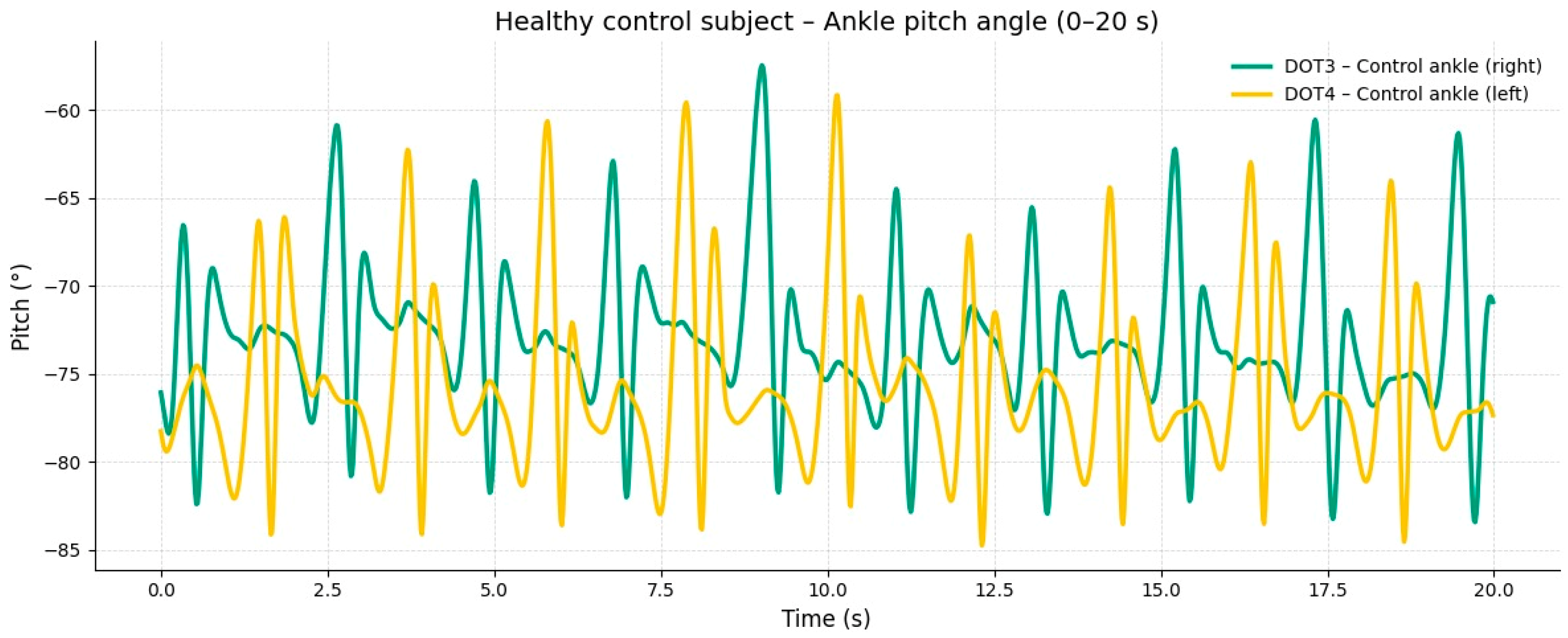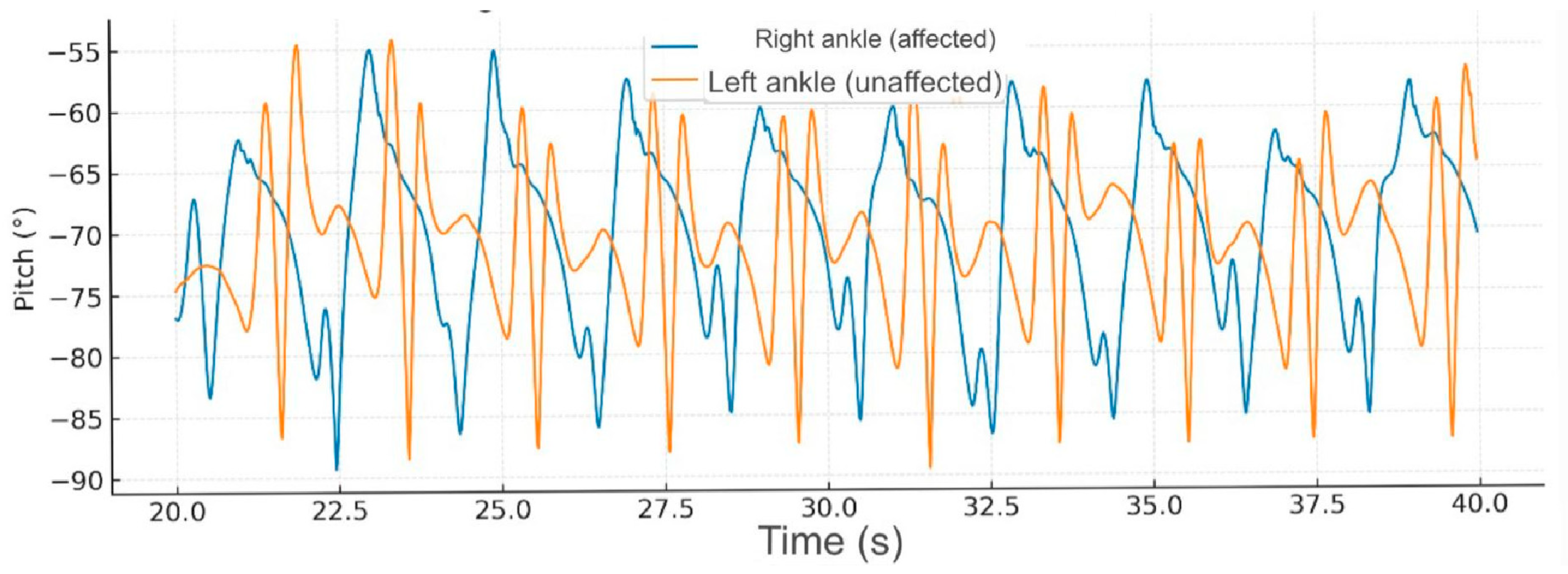 The corresponding signals recorded from the healthy control subject at the same walking speed showed regular, symmetric, and stable pitch oscillations in both ankles (
