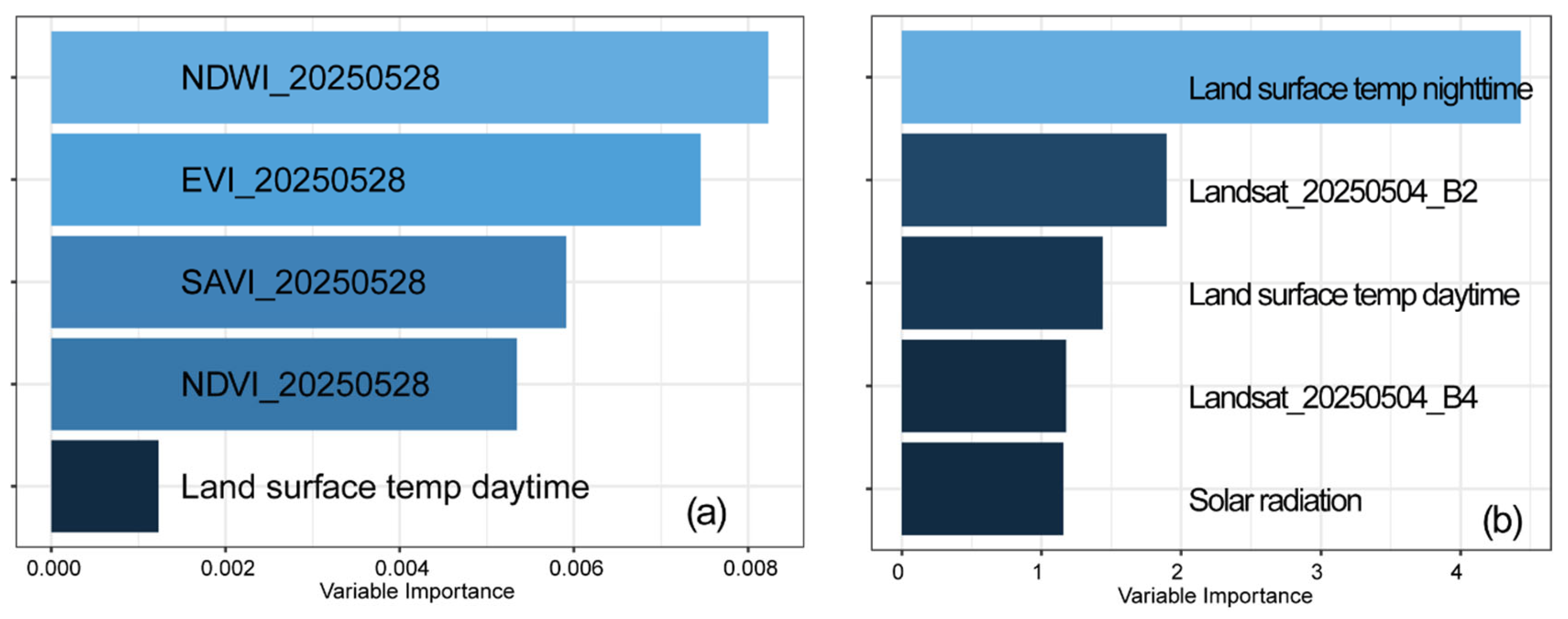 - The best modeled soil properties (Ksas and MEA) were controlled by different variables. The spatial distribution of Ksas was controlled by spectral indices, mainly due to the distinctive spectral response of Solonchak soils. Climate variables (land surface temperature and solar radiation) and Landsat bands (green and NIR) were crucial for the MEA model, highlighting correlations between different soil types and their surface spectral signal.
