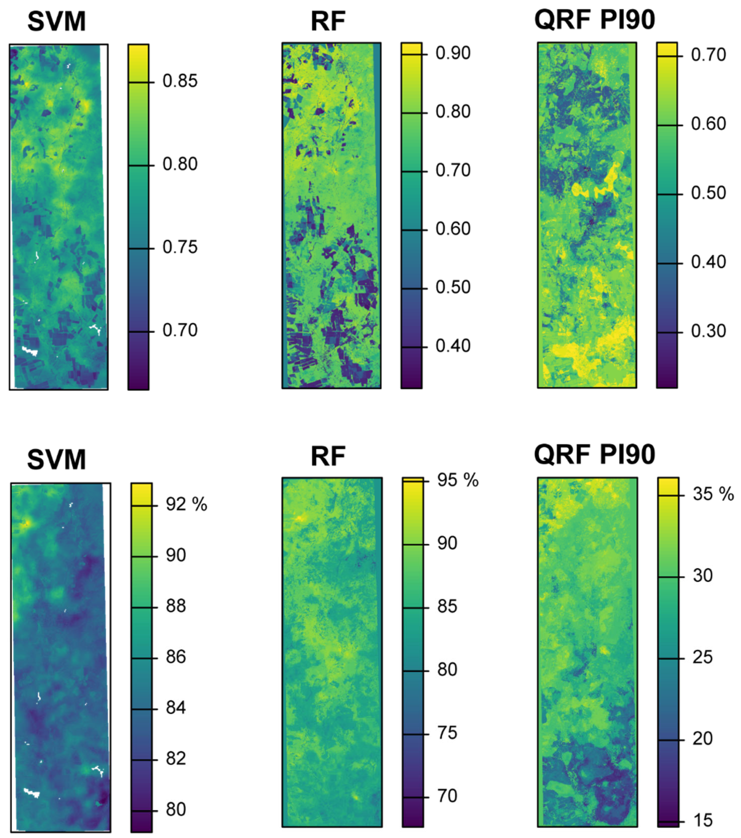 - Among the ML approaches tested, SVM achieved the best accuracy for predictions of most properties (Ks, Ksas, MEA, WSMIA, and WSMEA), according to the cross-validation strategy. RF and Elastic Net were the best algorithms for MAA and MIA predictions, respectively. The best prediction model was achieved for Ksas under the SVM algorithm and resulted in R2 = 0.50 and RMSE = 0.17. The second most accurate model (R2 = 0.30 and RMSE = 7.70%) was obtained for MEA modeling.