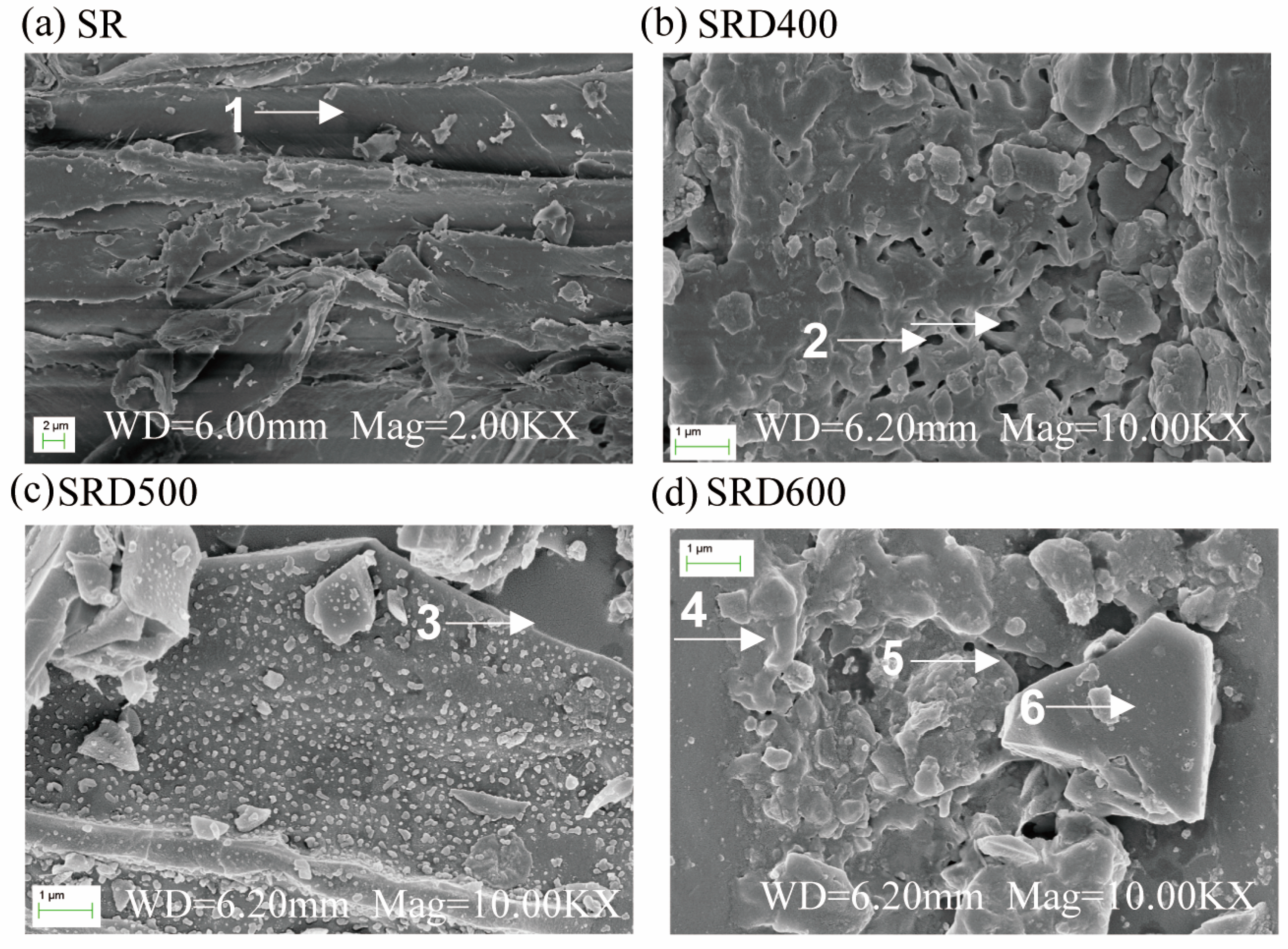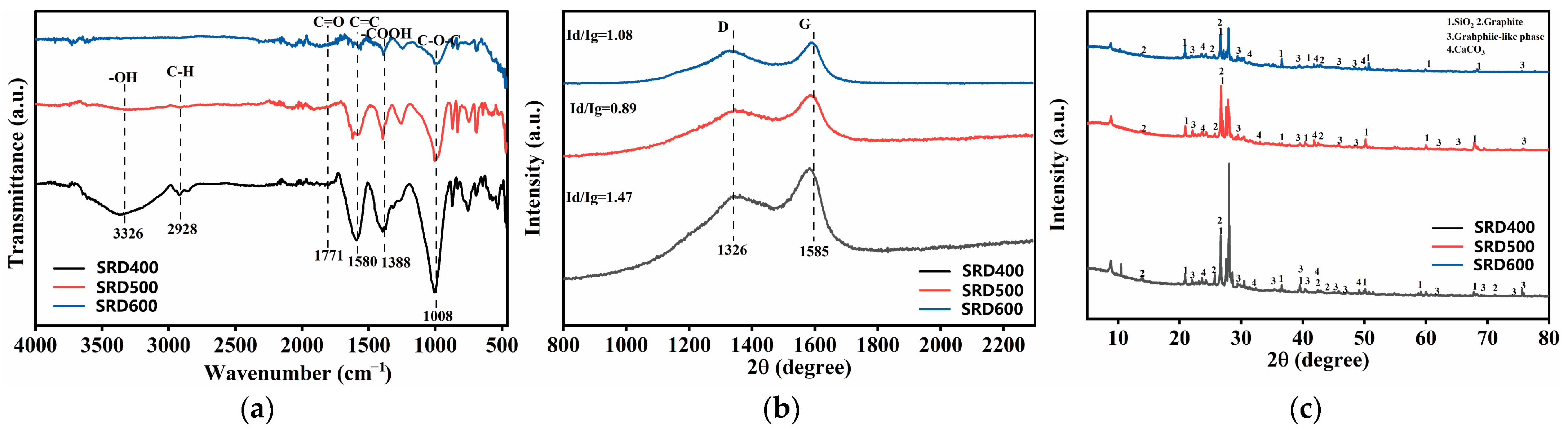 - Sathyabama, K.; Firdous, S. Effect of pyrolysis temperature on the physicochemical properties and structural characteristics of agricultural wastes-derived biochar. ACS Omega 2025, 10, 37013–37024. [Google Scholar] [CrossRef]