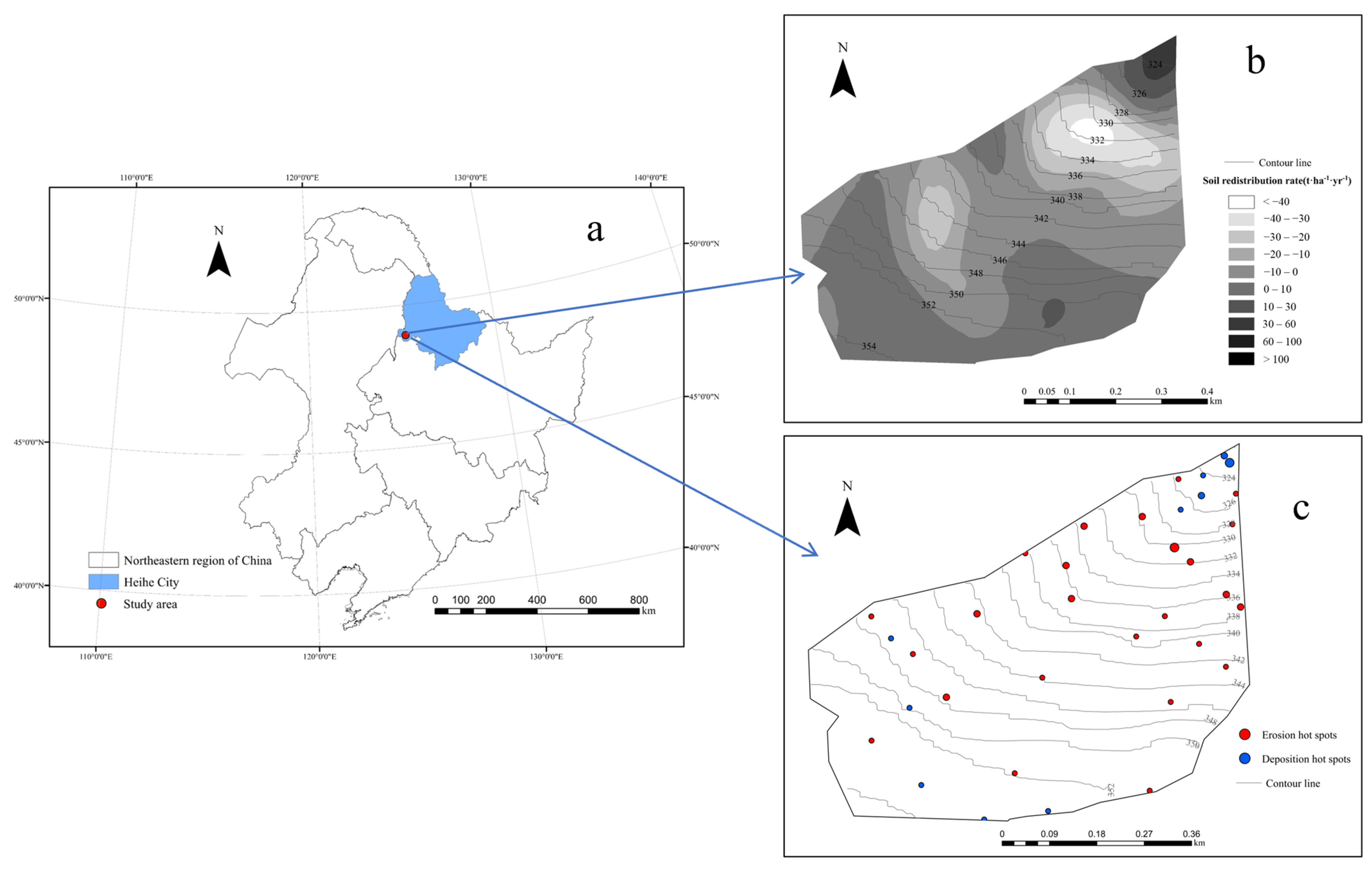 - Liu, C.; Liu, G.; Dan, C.X.; Shen, E.S.; Li, H.R.; Zhang, Q.; Guo, Z.; Zhang, Y. Variability in mollic epipedon thickness in response to soil erosion-deposition rates along slopes in Northeast China. Soil Tillage Res. 2023, 227, 105616. [Google Scholar] [CrossRef]