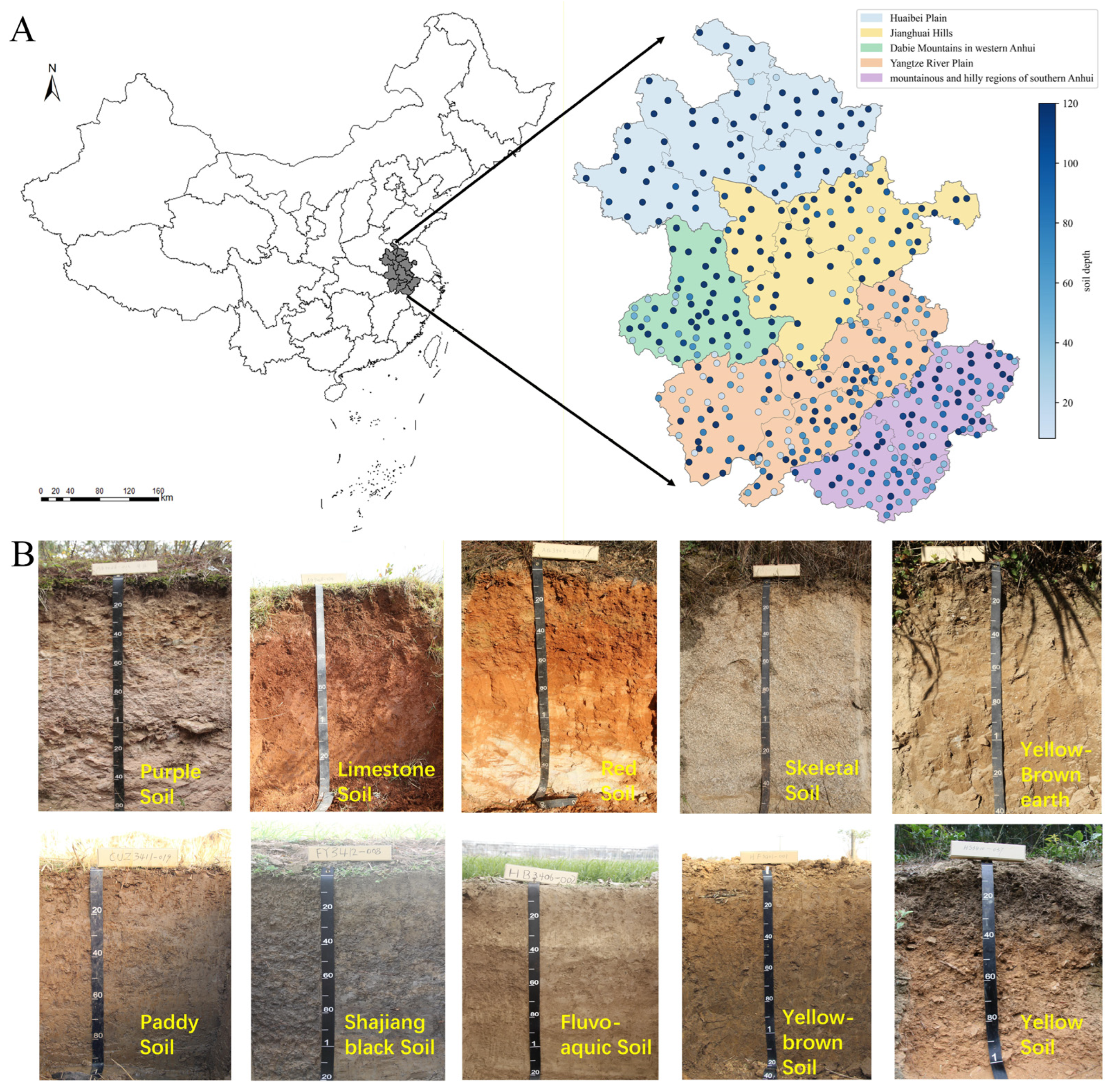 - Lu, L.; Wang, J. High-resolution mapping of soil texture at various depths in Anhui Province, China. Earth Sci. Inform. 2025, 18, 174. [Google Scholar] [CrossRef]