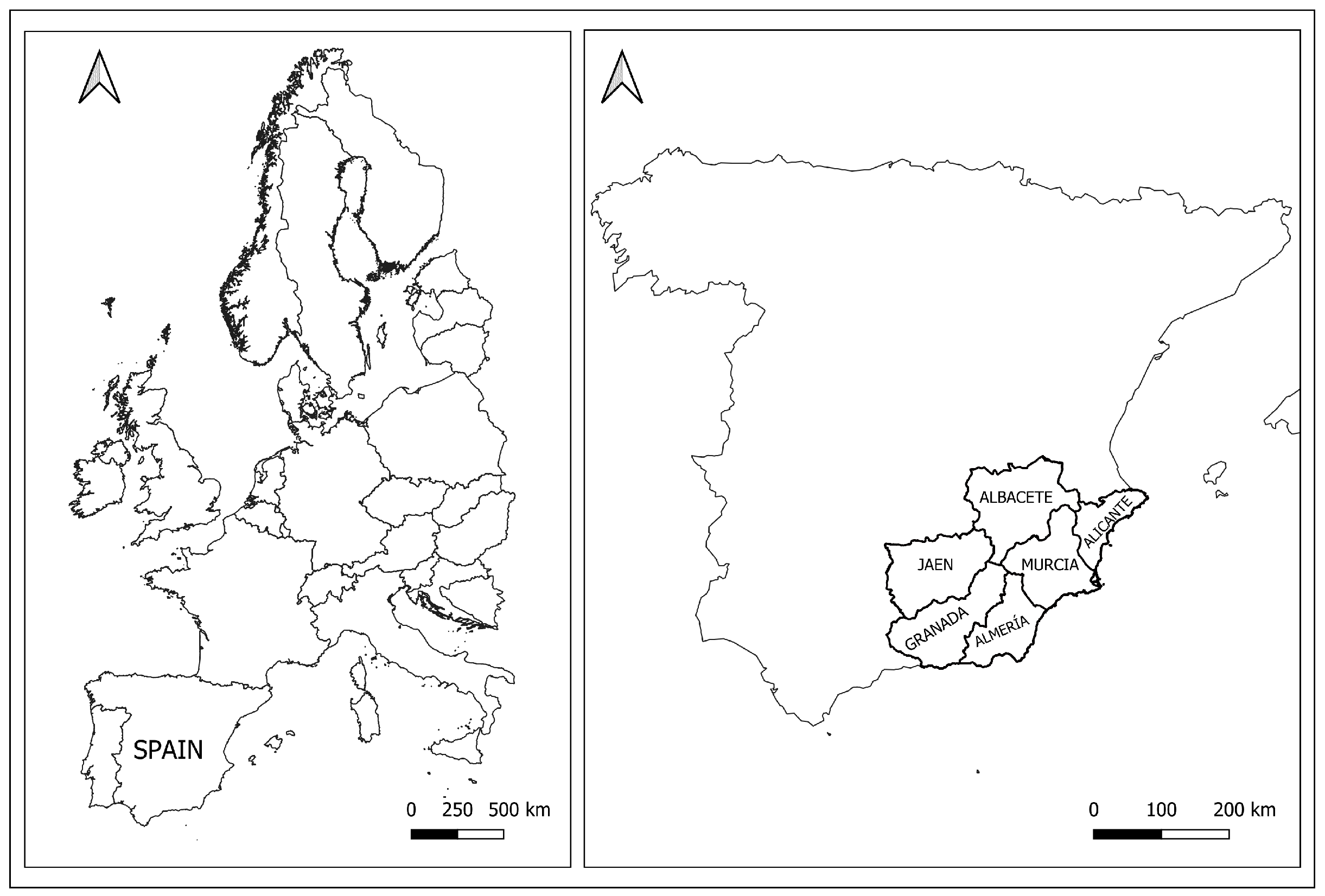 Arid climatic conditions, accelerated by anthropogenic actions, lead to soil desertification [9]. The area covered by this study includes the provinces of Albacete, Alicante, Almería, Granada, and Jaén (Figure 2).