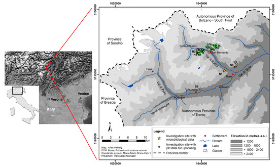 The study area is located in the northeastern Italian Alpine valley Val di Rabbi in the Autonomous Province of Trento (Figure 1). With reference to geology, the study area is part of the Central Alps, characterized by siliceous bedrock. The dominant parent materials are acidic paragneiss, mica schists, phyllites and orthogneiss [30,31]. The climate of the study area is governed by the high relief intensity of the Alpine environment. Climatic variations are generally due to differences in elevation and slope exposure, with the local climatic situation being more complex [32]. The mean annual air temperature in the study area ranges from about 2 °C close to the tree line to 7 °C at the lowest sites near the valley bottom. The mean annual precipitation is about 800–850 mm [33]. The main soil classes in the study area are Haplic Cambisols (Dystric) and Umbric Podzols below ca. 1900 m a.s.l., whereas Entic Podzols, Albic Podzols and Umbric Podzols are dominant in the forest above ([34], according to [35]).
