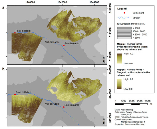Predicted distribution of the two modeled humus form dimensions: (a) presence of organic layers above the mineral soil; (b) biogenic soil structure in the mineral soil.