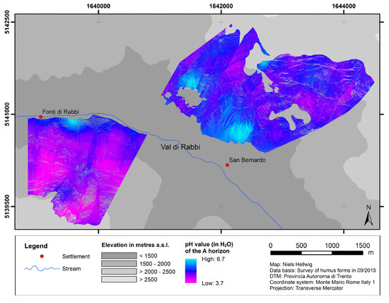 The distribution of pH values of the A horizon likewise relates to the topographical situation, which influences the microclimatic conditions and the kind of litter: low pH values (around 4.0–4.5) are clearly dominant on the north-exposed slope (except for the very lowest part). In contrast, on the south-exposed slope there is a trend of relatively high pH values (around 6.5) decreasing with elevational gain to lower average values (around 4.5–5.0). Consequently, the analogous distributions of humus forms and pH values generally turn out as expected [6]: the presence of mull-like humus forms characterized by a high biological activity in the mineral soil coincides with higher pH values as compared to moder-like humus forms. Altogether, these findings at the slope scale confirm and amplify the trends from modeling at broader scales [9,57].