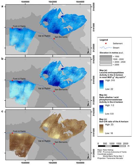 Topsoil pH values appear to be useful for upscaling three out of the four parameters investigated in this study: leucine-aminopeptidase activity, ratio of alkaline/acid phosphomonoesterase activity and C/N ratio. The significant correlations that we found between pH values, C/N ratio and enzyme activities correspond to the study of Leifeld and von Lützow [59], who found that microbial soil organic matter decomposition depended on pH and substrate C/N ratio rather than on inherent chemical substrate properties. As linear models depending on pH value were used for upscaling (Table 6), the predicted spatial patterns of enzyme activities and C/N ratio are arranged in the same spatial patterns as the pattern of pH values (Figure 5). The significant relationships that we found between predicted humus form dimensions on the one hand and predicted pH values, enzyme activities and soil C/N ratio on the other hand suggest that also humus forms are a suitable indicator of microbiological processes related to organic matter decomposition.