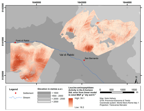 Leucine-aminopeptidase activity has an important role in the nitrogen (N) cycle, as it catalyzes the hydrolysis of leucine and other amino acids from protein or peptide substrates [13]. Bacteria play a relevant role in the production of leucine-aminopeptidases [14] and, accordingly, Bardelli et al. [15] observed a greater activity in south-facing subalpine forest soils where a greater bacterial abundance was recorded in comparison with north-facing slopes.