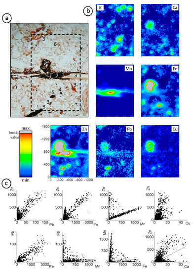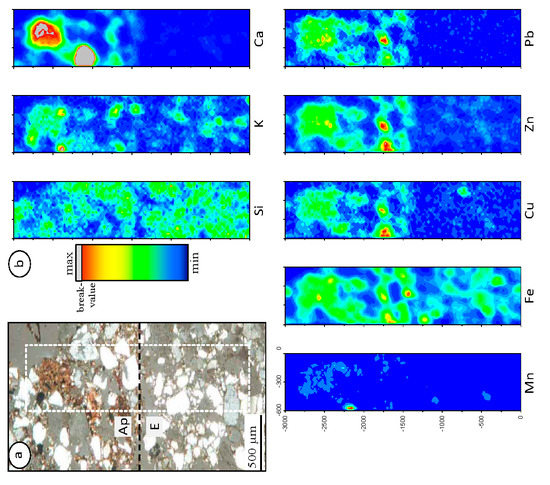 - Scarciglia, F.; Barca, D. A powerful tool for assessing distribution and fate of potentially toxic metals (PTMs) in soils: Integration of laser ablation spectrometry (LA-ICP-MS) on thin sections with soil micromorphology and geochemistry. Environ. Sci. Pollut. Res. 2017, 24, 9776–9790. [Google Scholar] [CrossRef] [PubMed]