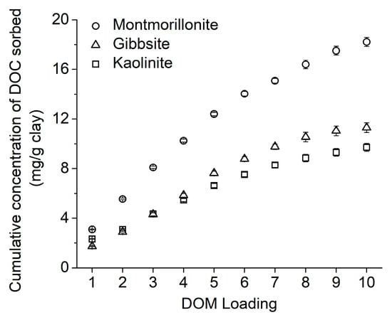 Figure 1 shows the cumulative concentration of DOC sorbed by each mineral (in milligrams of DOC per gram of clay) during each successive DOM loading experiment. Montmorillonite sorbed a greater concentration of DOC than kaolinite and gibbsite during all ten loading steps. This is consistent with the higher SSA of montmorillonite compared to the other two minerals (Table 1), and with previous studies which suggested that DOC sorption to minerals increases with increasing mineral SSA [,,,]. Kaolinite and gibbsite initially sorbed a similar concentration of DOC, but from loading five onward gibbsite sorbed a higher concentration of DOC than kaolinite. Given that the SSA for gibbsite is lower than kaolinite (Table 1), this observation suggests that mineral–DOM interactions are not limited by SSA alone. The cumulative concentration of DOC sorbed by each mineral increased consistently over the first five DOM loadings. During these initial loadings, DOM likely sorbed to the organo-clay complexes through primarily direct mineral–OM interactions [,]. Although the concentration of DOC sorbed continued to increase with progressive DOM loading, less DOC sorbed to the organo-clay complexes during the last four sorption steps compared to the initial and intermediate loadings, especially for kaolinite and gibbsite (Figure 1). This trend implies that sorption sites on kaolinite and gibbsite surfaces may have approached saturation after several successive DOM loadings. As a result of this mineral saturation, the DOM sorbed to the organo-clay complexes during the later loadings may have sorbed via a combination of mineral–OM and OM–OM interactions [,,], rather than just direct mineral-OM associations as likely occurred in the initial loadings. These OM-OM interactions may be an important factor governing the quantity of DOC sorbed by minerals with low SSA since these mineral surfaces require less DOC to become saturated than minerals with high SSA, such as montmorillonite. Furthermore, it is important to note that we did not explicitly investigate the desorption of DOC from the organo-clay complexes during the DOM loading experiments. However, the DOC measurements before and after sorption showed a net increase in DOC concentration with each sorption step (Figure 1), suggesting that the amount of DOC sorbed was greater than any potential DOC that desorbed from the organo-clay complexes.