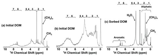The initial DOM solution and the unbound DOM samples following sorption to minerals contained several types of OM components that have been identified previously in DOM using solution-state NMR spectroscopy []. Representative 1H and DE 1H NMR spectra of the initial DOM solution (before sorption) with specific OM components labelled are shown in Figure 2a,b, respectively. In addition, Supplementary Materials Figures S1–S3 and S4–S6 show the 1H and DE 1H NMR spectra, respectively, of the thirty unbound DOM samples following sorption to kaolinite, montmorillonite or gibbsite. Signals in the aliphatic region include protons of CH2 groups in DOM constituents with polymethylene chains, such as cutin, suberin, lipids and waxes (1.25 ppm), while protons of CH3 groups in aliphatic lipids, lignin and proteins (0.85 ppm) also resonate in this region [,]. N- and O-substituted aliphatic resonances arise from protons in CH2 groups near polar functional groups, such as those β or γ to carboxylic acid groups in lipids or in amino acid sidechains []. Signals within this region also contain contributions from protons of N-acetyl groups in biopolymers such as peptidoglycan and chitin as well as protons in microbial-derived, short-chain carboxylic acids which are products of OM degradation []. The O-alkyl region contains signals from protons in DOM constituents such as carbohydrates, with lesser contributions from protons in proteins and methoxy groups of lignin. Signals from anomeric protons in carbohydrates were also observed. Distinct signals for protein-derived DOM components include the α-proton and amide proton resonances []. Aromatic and phenolic resonances originate from protons in aromatic amino acids such as phenylalanine and tyrosine as well as from lignin-derived compounds [,].