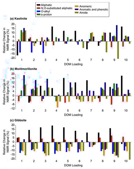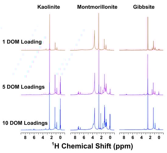 Supplementary Materials Figures S7 and S8 show the proportion of 1H NMR signal arising from the seven major types of OM components that were identified in the 1H and DE 1H NMR spectra, respectively, of the initial DOM and the thirty unbound DOM samples following sorption to kaolinite, montmorillonite or gibbsite. To better visualize compositional differences between the DOM before sorption and the unbound DOM components after batch equilibration, the percent change in the NMR signal area for each of the seven components following each DOM loading are shown in Figure 3 and Supplementary Materials Figure S9 for the 1H and DE 1H NMR spectra, respectively. A positive percent change indicates sorption of a DOM component to the organo-clay complex, whereas a negative percent change indicates that a specific component accumulated in solution and was not sorbed (e.g., unbound). To provide further evidence of DOM sorption onto clay minerals, Figure 4 shows the 1H HR-MAS NMR spectra of OM components sorbed to the kaolinite, montmorillonite and gibbsite organo-clay complexes (swollen in DMSO-d6) after one, five and 10 DOM loadings. The HR-MAS NMR signal intensity of the sorbed OM increased between loadings one and five, in agreement with the DOC results in which the concentration of DOC sorbed increased consistently during the first five DOM loadings (Figure 1). From loadings five to 10, the HR-MAS NMR signal intensity increased marginally for gibbsite and small increases were observed for kaolinite and montmorillonite (Figure 4). This is consistent with the sorbed concentration DOC data where a lower concentration of DOC was found to sorb to the organo-clay complexes during the higher loadings compared to the initial loadings. Therefore, the HR-MAS NMR results further supports that the clay mineral surfaces became saturated with DOC during the later sequential DOM loading steps and their capacity to sorb more carbon was reduced.