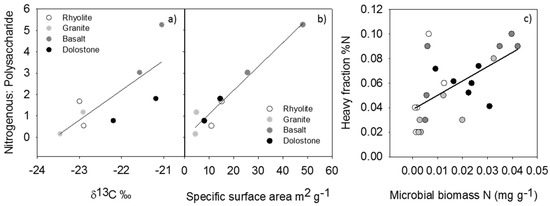 (a) Heavy fraction δ13C abundance vs. nitrogenous: polysaccharide, r2 = 0.60, p = 0.0241; (b) heavy fraction specific surface area vs. nitrogenous: polysaccharide, r2 = 0.95, p < 0.0001; (c) heavy fraction %N vs. microbial biomass N, r2 = 0.39, p = 0.0015.