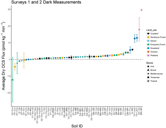 Net OCS soil fluxes from two independent soil surveys measured at approximately 17 °C in the dark in Survey 1 (bold text) and Survey 2 (normal text). Survey 1 fluxes at 17 °C were estimated from measured fluxes at 20.5 °C using the temperature sensitivity for each soil. Site biome is indicated by symbol type and land use by color. Error bars represent standard deviation of three soil replicates measured in Survey 2. Positive OCS fluxes indicate emissions of OCS from soils, while negative fluxes indicate net OCS uptake.