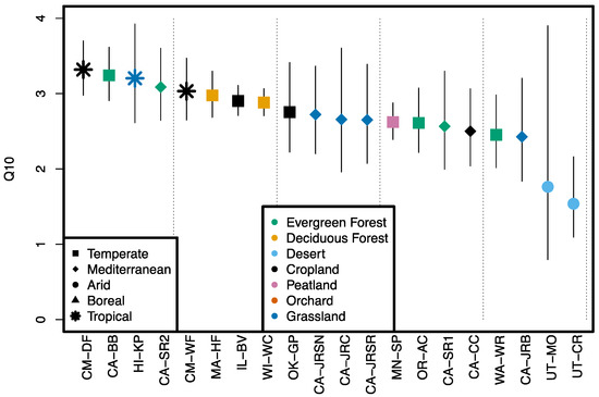OCS production temperature sensitivity (Q10) for Survey 1 soils observed over temperature ramp between 15 °C and 40 °C in the dark. Site biome is indicated by symbol type and land use by color. Error bars indicate upper and lower 95% confidence intervals on exponential fit.