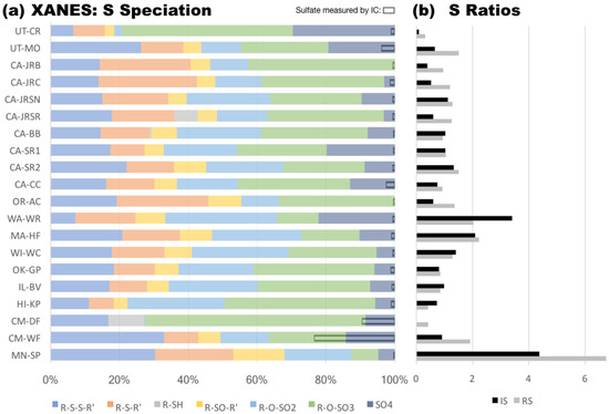 Soil sulfur speciation (Survey 1). For each site, (a) relative proportion of sulfur species (% total S) as measured by XANES (solid bars) and compared with total sulfate measured by IC (right-justified outline bars); and (b) S species ratios including (RS) highly reduced to highly oxidized (grey bars) and (IS) intermediate oxidized to highly oxidized (black bars). Sites ordered as in Table 5.
