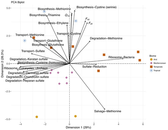 Microbial function predicted from community composition of soils prior to drying may yield information regarding S compounds relevant to OCS production. We estimated the relative abundance of microbial S cycling pathways (see Section 2.3.1), including dissimilatory (e.g., sulfate reduction), assimilatory (e.g., cysteine biosynthesis), degradation (e.g., methionine degradation), and transport (e.g., sulfate transport) pathways. OCS production was correlated with the predicted prevalence of biosynthesis of S-containing amino acids such as cysteine (R-SH) and methionine (R-S-R’). PCA analysis of predicted microbial pathways (Figure 4) associated F20, F40, and Q10 with the biosynthetic pathways for cysteine, methionine, thiamine (vitamin B1 synthesized from cysteine, S-containing pentane ring), and ethylene (by-product in methionine salvage pathway) along Dimension 2, which also separated sites by biome. Along Dimension 2, transport of methionine, glutathione (R-SH; essential S carrier in some organisms), and cystine (R-S-S-R’) and methionine degradation (to homocysteine, R-SH) also increased with OCS production, while methionine salvage (as opposed to degradation) decreased. OCS production terms were nearly orthogonal to sulfate cycling pathways, which were aligned with Dimension 1. This axis separated soils with high proportions of bacteria and sulfate reduction from those with relatively more eukaryotes and archaea, organic sulfur degradation, and sulfate transport. Cysteine biosynthesis by the two different pathways were orthogonal in the PCA, with alignment of bacterial cysteine biosynthesis from serine along Dimension 2 in contrast to fungal cysteine biosynthesis from homocysteine along Dimension 1. Soils from the Mediterranean biome were more similar in predicted S cycling than those collected from temperate biomes, which spanned the variance of Dimension 1.