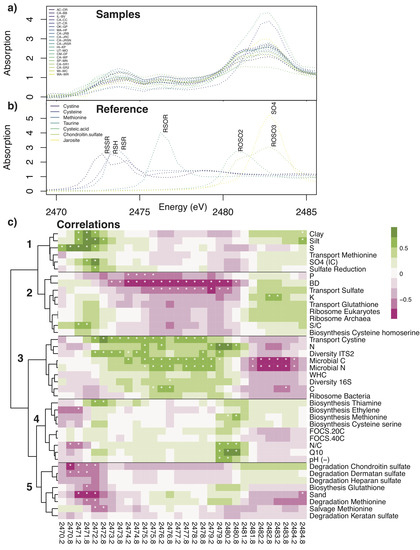 Finally, raw S XANES spectra (before composition estimation against reference spectra) were analyzed by dividing the 2470 eV to 2486 eV spectral region into 30 bins to assess correlations (pairwise Pearson’s product moment) between the site-averaged soil chemical, physical, and microbial data and XANES absorption within each 0.5 eV bin.