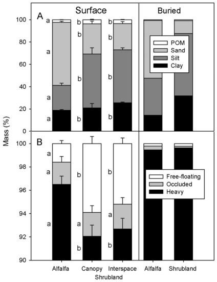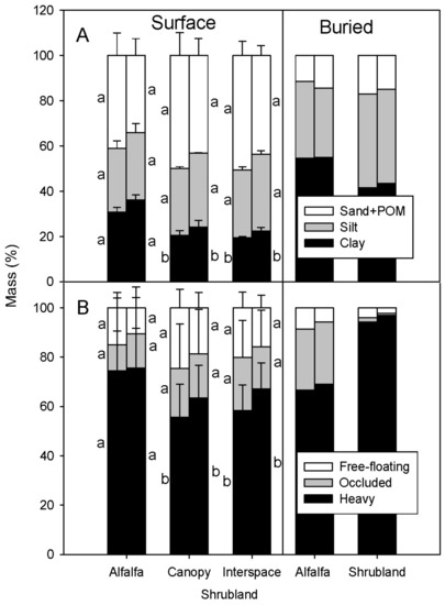Distribution of particle size fractions (A) and density fractions (B) in surface and buried soil horizons in alfalfa and shrubland sites. Note that the scale for the density fraction graph starts at 90%. The error bars represent the standard deviations from the mean. Different lowercase letters represent significant differences between soils (p ≤ 0.05). Only one replicate was used for the buried soil layers, so no standard deviation was calculated.