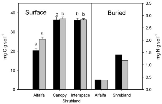 Total organic C (black bars) and N (grey bars) in surface and buried soil horizons in alfalfa and shrubland sites. Error bars represent the standard deviations of the mean. Lowercase letters represent significant differences in C or N between soils (p ≤ 0.05). Only one replicate was used for the buried soil layers, so no standard deviation was calculated.