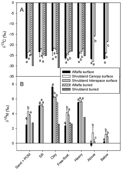 The δ13C values for all particle size fractions were statistically similar in the surface soils of both sites (Figure 4A). The δ13C of the free-floating and heavy fractions were isotopically lighter in the alfalfa than the shrubland surface soils. The heavy density fraction of the alfalfa surface soil and shrubland buried layer had similar δ13C values, but these were isotopically lighter than all other soils. The heavy density fraction in the alfalfa buried layer had the heaviest isotopic value of all soils.