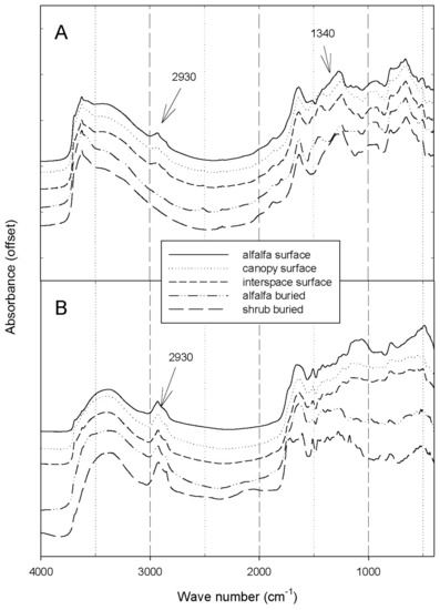 The mid-infrared spectra from the bulk soil showed chemical differences in response to management and soil depth (Figure 5A). The surface soil samples, particularly the alfalfa surface soil, had prominent absorbance at the aliphatic CH band at 2930–2850 cm−1. The alfalfa surface soil displayed a shoulder of increased absorbance at 1400–1270 cm−1 (aliphatic C, carboxylate or ester C-O) but this shoulder was not very prominent in the shrubland surface soils. Both shrubland surface soils showed a peak at 1470–1440 cm−1 (amide II, aromatic stretch, C-O, carbonates; [71]) but this peak was absent in the spectrum of the alfalfa surface soil. The two buried horizons had different spectral properties, with the alfalfa buried horizon having higher absorbance at 1120 cm−1 (polysaccharide C-O-C, C-O) and at 1580–1400 cm−1 (aromatic C=C, and CH).