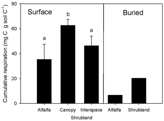 Cumulative microbial respiration for the eight-week laboratory incubation in surface and buried soil horizons in alfalfa and shrubland sites. Error bars represent the standard deviation from the mean for each soil’s total CO2 production and different lowercase letters represent significant differences between soils (p ≤ 0.05). Only one replicate soil was used for the buried soil layers, so no standard deviation was calculated.