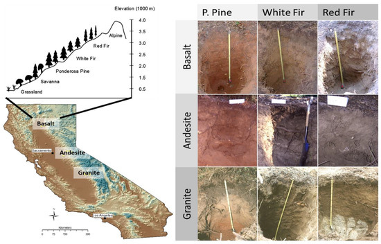 The western slope of the Sierra Nevada provides an ideal setting to address parent material and soil mineral assemblage controls on C partitioning and residence time. The western slope encompasses a large environmental gradient that varies predictably with elevation (Figure 1), where temperature decreases with elevation at the same time that precipitation increases and changes from predominantly winter rain to snow at high elevations (Table 1). Vegetation communities change concurrent with climate grading from oak woodlands to alpine and subalpine communities. The absolute elevation boundaries of ecosystem transitions change with latitude, i.e., ecosystem elevation limits decrease with increasing latitude, following macroclimate variation. Historical fire regimes also vary with elevation, grading from a regime typified by frequent, low to mixed intensity fires at lower elevations to one typified by low frequency, high intensity fire at higher elevations [47,48].