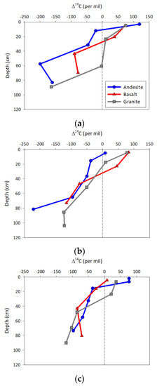 Depth profiles of radiocarbon content for the (a) ponderosa pine, (b) white fir, and (c) red fir ecosystems. Values are plotted at the horizon midpoint depth. The dashed vertical line at zero denotes the break between older depleted and positive “modern” radiocarbon values.