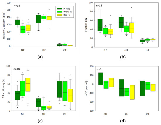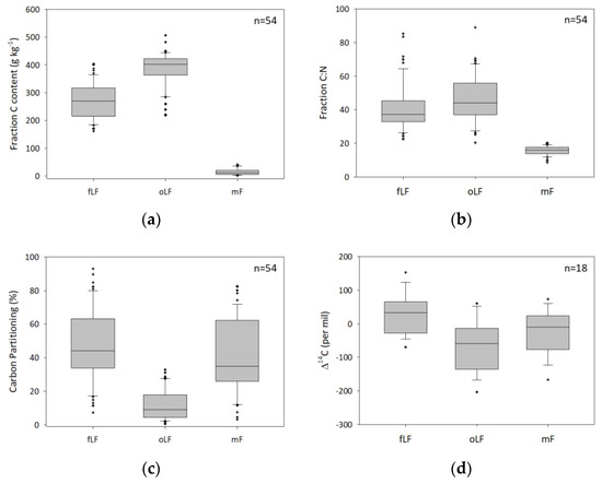 Box plots of (a) carbon content (g kg−1), (b) C:N ratio, (c) percent of total carbon in each fraction, and (d) radiocarbon content for the free light fraction (fLF), occluded light fraction (oLF), and mineral fraction (mF) with all data grouped together.