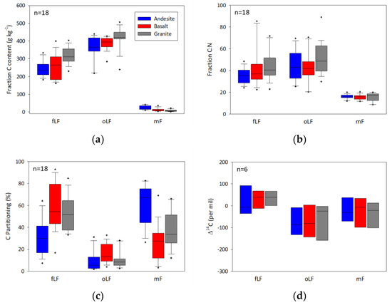 Box plots of (a) carbon content (g kg−1), (b) C:N ratio, (c) percent of total carbon in each fraction, and (d) radiocarbon content for the free light fraction (fLF), occluded light fraction (oLF), and mineral fraction (mF) with data grouped by parent material.
