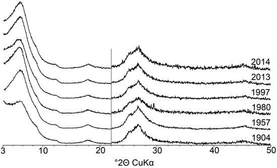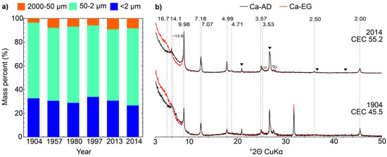 Rivard et al. [52] also noted the presence of illite/muscovite, kaolinite, chlorite, and expandable clay minerals which are present in the investigated samples. To refine the description of these clay minerals, results of XRD analysis of oriented slides prepared from samples <2 µm fractions are shown in Figure 1b. Qualitative analysis of the profiles identifies the presence of quartz and feldspars (Figure 1b, solid black and open triangles, respectively). Discrete illite can be identified through the presence of a rational series of 00l reflections at 9.98, 4.99 and 2.00 Å (the contribution at 3.33 Å is overlapped by that of quartz). Discrete chlorite and kaolinite can also be identified from their rational series of 00l reflections at 14.1, 7.07, 4.71, 3.53 and 2.35 Å (weak) and 7.16, 3.58 and 2.39 Å, respectively; these reflections remain unchanged on EG solvation. The presence of a mixed layer dominated by expandable layers can be identified from the shifts in the peak position of the broad reflection from ~13.6 to ~16.7 Å following EG solvation. Comparison of the XRD patterns of the <2 µm fractions for the samples from 1904 to 2014 shows no systematic variation in either the position or the intensity of the reflections for individual clay phases (Figure 1b). On the contrary, CEC data (Table 1) show an increase of 17% in the CEC from 47–48 cmolc kg−1 in 1904 and 1957 to 55 cmolc kg−1 in 2014 that apparently contradicts the stability of minerals in the clay fraction. An enhanced description of the clay mineralogy is thus necessary to unravel the origin of the measured CEC evolution with time, and subsequent fractionation of the <2 µm was thus performed.