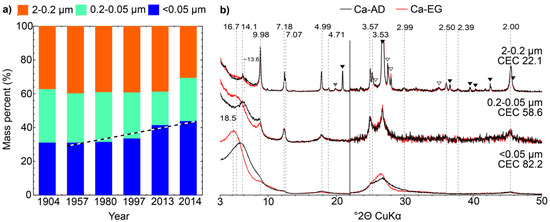 In the <2 μm subfractions (Figure 2a) the proportion of 2–0.2 μm subfraction is relatively constant at 32–34% for 1957–2014 samples while for 1904 the proportion is 39%, consistent with a possible sample grinding. The proportion of the <0.05 µm subfraction increases almost linearly from 37% in 1957 to 46% in 2013–2014. Consistently, the proportion of 0.2–0.05 μm subfraction decreases from 29% to 22% in the same timeframe. CEC data for 2014 subfractions show a variation with size from 81 cmolc kg−1 for the <0.05 µm subfraction to 14 cmolc kg−1 for the 2–0.2 μm subfraction (Table 2). The CEC measured for the bulk <2 µm fraction of sample 2014 (55.2 cmolc kg−1) is consistent with that calculated as a weighted average of the different subfractions (57.8 cmolc kg−1—Table 2). The overall CEC increase with time is thus consistent with the increased proportion of the finest subfraction, which has the highest CEC.