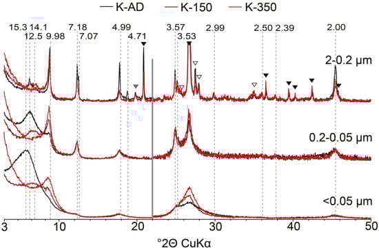 Comparison of experimental XRD profiles collected for K-AD and K-150 and K-350 slides of the different subfractions of sample 2014. Symbols and notations as in Figure 1b and Figure 2b. The vertical grey bar represents an increase in intensity of the high-angle region compared to the 2−22° 2θ angular range (×2 scale factor).