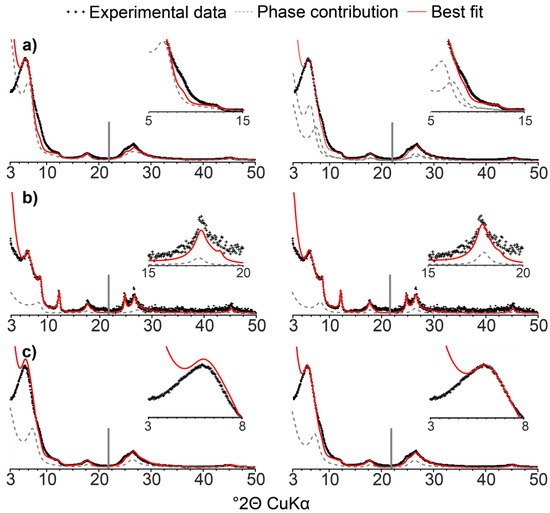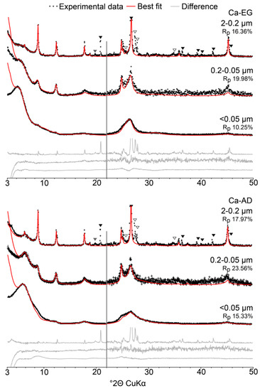 For modelling the <0.05 µm subfraction, an illite-S2-S1-chlorite (ISSCh) was introduced to account for the broad maximum at ~10 Å (Ca-AD pattern). Wa, which expresses the proportion of the first layer type in a given mixed layer (in this case illite), was optimized at ~90% (phase notation ISSCh 90). The presence of both S2 and chloritic layers was necessary to properly replicate the position of this maximum in both AD and EG states. A second ISSCh dominated by smectite layers accounts for the maximum at ~15.3 Å and the broad low-intensity shoulder centered on 3.10 Å (Ca-AD state). The position of the low-angle reflection in the AD specimen (~15.3 Å) and its shift to ~18.5 Å upon EG solvation is indicative of an essentially expandable contribution. A small proportion of chloritic layers were introduced, however, due to the non-complete collapse of K-150 samples to ~10 Å. This mixed layer also contains ~5% illite layers (ISSCh 5). Two additional ISSCh (ISSCh 50 and ISSCh 35) were considered to account for the broad and weakly modulated high-intensity range between the previous two contributions at ~10 and ~15.3 Å (Ca-AD pattern—Figure S2). ISSCh 50 also significantly contributes to reflections at 4.90 and 3.38 Å (Ca-AD state), whereas ISSCh 35 provides a significant contribution to the broad reflection centered on 8.50 Å (Ca-EG state) and to the reflection at ~3.38 Å (both Ca-AD and Ca-EG states). Most of these mixed layers contained chloritic layers to account for the incomplete collapse of the 001 reflection between ~12 and ~14 Å following K-150 treatment. Finally, a pure smectite with extremely low CSD size was necessary to account for the shoulder at 20.30 Å (Ca-EG), and a minor KI contribution (Wa = 80) was hypothesized to explain the asymmetric kaolinite peak tails at 7.25 and 3.52 Å (Figure S2). To reproduce the apparent irrationality of the spacing, partial segregation was assumed between the two layer types (KI R1 notation).