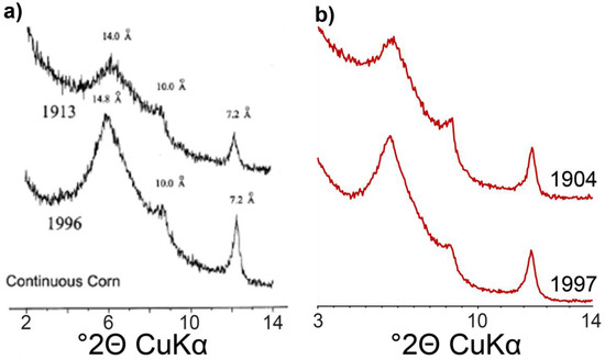 Comparison of the experimental XRD data obtained by (a) Velde and Peck [15] from <2 µm fractions; and (b) in the present study from 0.2–0.05 µm subfractions.