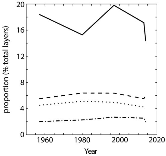 Relative proportions of the different layer types in the <2 µm fraction as a function of time. Layer-type proportions are calculated as the weighted sum of a given layer abundance in the different mixed layers present in 2–0.2, 0.2–0.05 and <0.05 µm subfractions. Illite, smectite, chlorite and kaolinite layers are plotted as solid, dashed, dotted, and dotted-dashed lines, respectively. Note: the strong variation in illite layer content observed in 1980 and 2014 is due mainly to large variations in the relative abundance of the 2–0.2 µm subfraction.