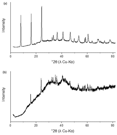 The X-ray diffractogram of the aged synthetic green rust sulfate stabilized with glycerol is shown in Figure 1a. No side products were observed by this method, but the green rust basal plane (003) peak at ~8° 2θ is smaller in intensity relative to other green rust XRD patterns from the literature [32,35]. When suspended in 13.33 mM Na2SO4 (the same ionic strength as the reaction solutions), the synthetic sulfate green rust transformed to the product shown in Figure 1b. This product is dominated by a poorly crystalline phase (most likely ferrihydrite), but peaks corresponding to magnetite and sulfate green rust were also identified. The green rust basal plane reflection at ~8° 2θ is not visible, possibly because the thick layer of glycerol added to stabilize the product disproportionally decreased reflection at low incident angles.