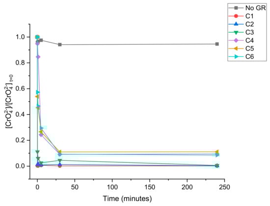 Since the green rust was added as a suspension, aqueous Fe2+ was present at the beginning of the reaction, but at a low concentration. The resulting reaction between CrO42− and Fe2+ may have been the reason for a pH drop to between 4 and 5 in each experiment. However, previous studies [43,44] suggest that the reduction rate of CrO42− by aqueous Fe2+ is rapid enough to contribute to the reaction kinetics observed in this experiment, but this reaction rate is heavily dependent on pH, the behavior of which was not monitored while the reaction was in progress. It is possible that the green rust surface may have acted as a substrate, increasing the rate of reduction [31].