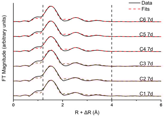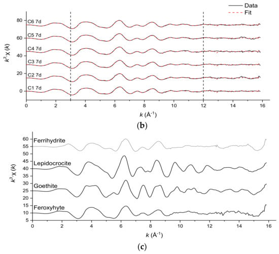 Fe EXAFS linear combination fits (k3-weighted, Table 2) were obtained by fitting the Fe EXAFS data of the 24-h (Figure 4a) and 7-day (Figure 4b) samples to a set of reference standards. In every fitted sample, the dominant detected Fe-bearing phase was feroxyhyte (δ’-FeOOH), the proportion of which increases in all reactions except C5 between 24 h and 7 days. Ferrihydrite was detected at very low levels in some samples, albeit the patterns for ferrihydrite and feroxyhyte were similar. Ferrihydrite EXAFS spectra vary with the preparation method used [36], and patterns for ferrihydrite have been published [37] that more closely align with our feroxyhyte patterns than our ferrihydrite patterns do. The other phases identified by EXAFS are goethite (α-FeOOH) and lepidocrocite (γ-FeOOH), the last of which contributes more to the overall fit at the expense of the goethite and feroxyhyte-like components as the initial CrO42− concentration decreases.