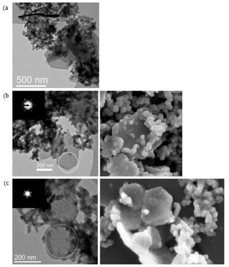 SEM and TEM images showing the progression of reaction C6 after 1 min (a), 10 min (b) and 7 days (c) of reaction time. Regions where electron diffraction measurements were obtained are circled. Spacings of 2.5 and 1.7 Å detected after 1 min and 10 min, very faint rings after 7 days.